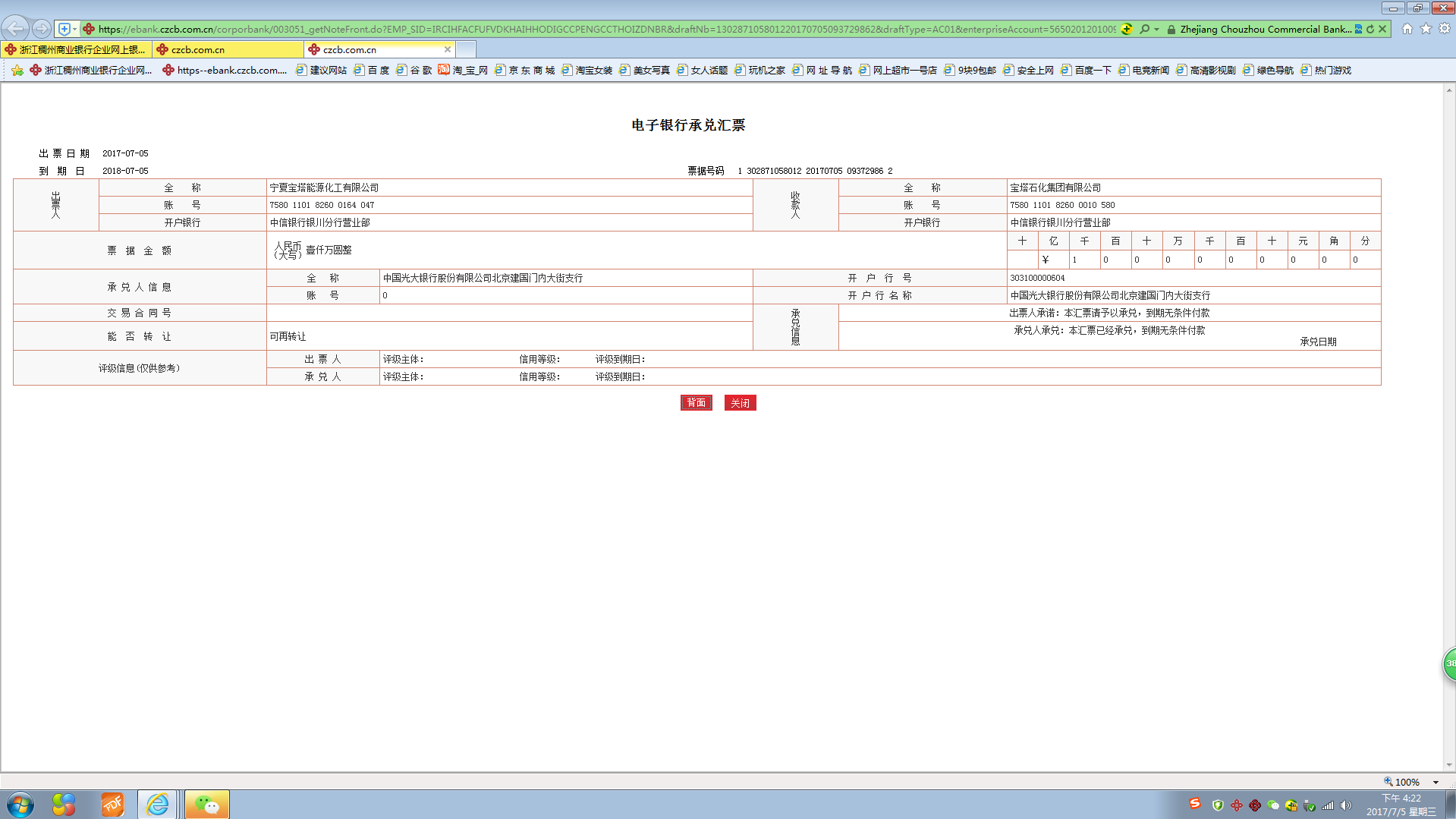 Time:2017-09-01公告 2017年7月7日,由我公司承兑的一张金额1000万元(大写:壹仟万元整)电子银行承兑汇票(票号:1 302871058012 20170705 09372986 2),近期被人蓄意将承兑人PS为中国光大银行股份有限公司